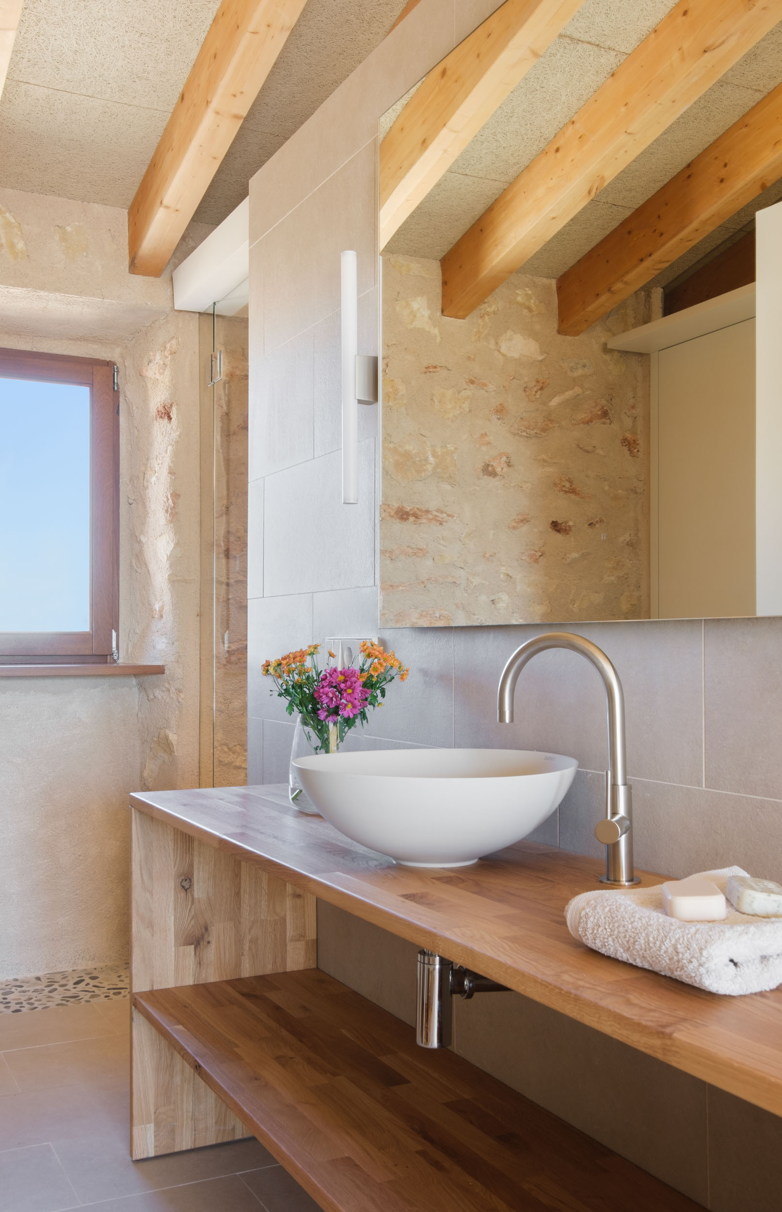 Interior: On the ground floor, the fully equipped kitchen, the large dining area with dining table and seating for ten people, as well as a cozy sofa corner with a comfortable sofa. One of the three bedrooms at Can Cunso 30 is on the ground floor, and three more bedrooms are on the upper floor. All bedrooms have their own en-suite bathroom. Air conditioning in all rooms. WiFi internet.